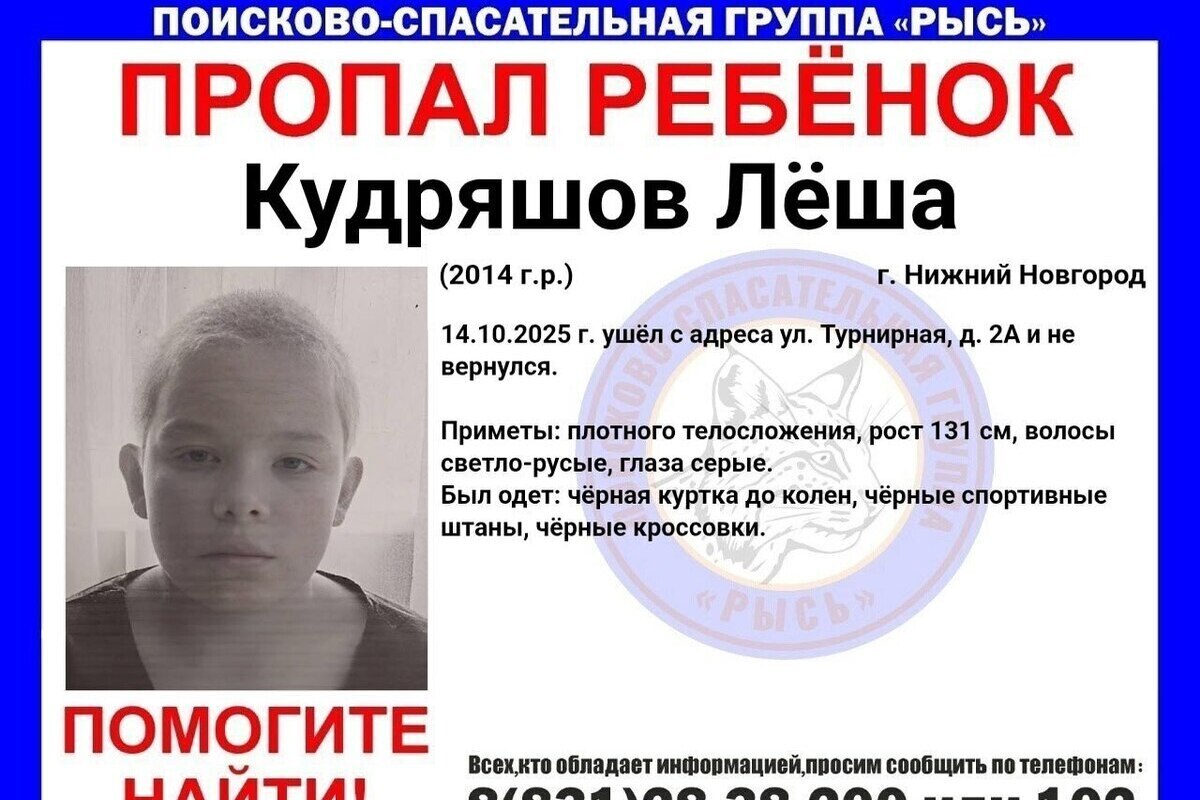 По данным поисково-спасательной группы «Рысь», 11-летний Лёша Кудряшов ушел с ул. Турнирной, дом 2А вечером 14 октября и до сих пор не вернулся. Приметы мальчика: плотного телосложения, рост 131 см, светло-русые волосы, серые глаза.