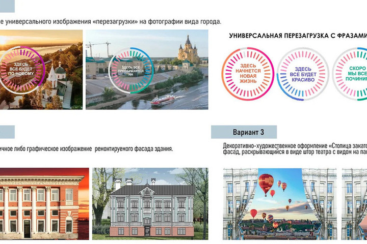 • Фотография городского пейзажа со стилизованным круглым символом «перезагрузки», внутри которого размещаются мотивирующие слоганы, такие как «Скоро здесь произойдут перемены», «Все преобразится», «В ближайшее время мы закончим ремонт» или «Здесь все станет лучше».