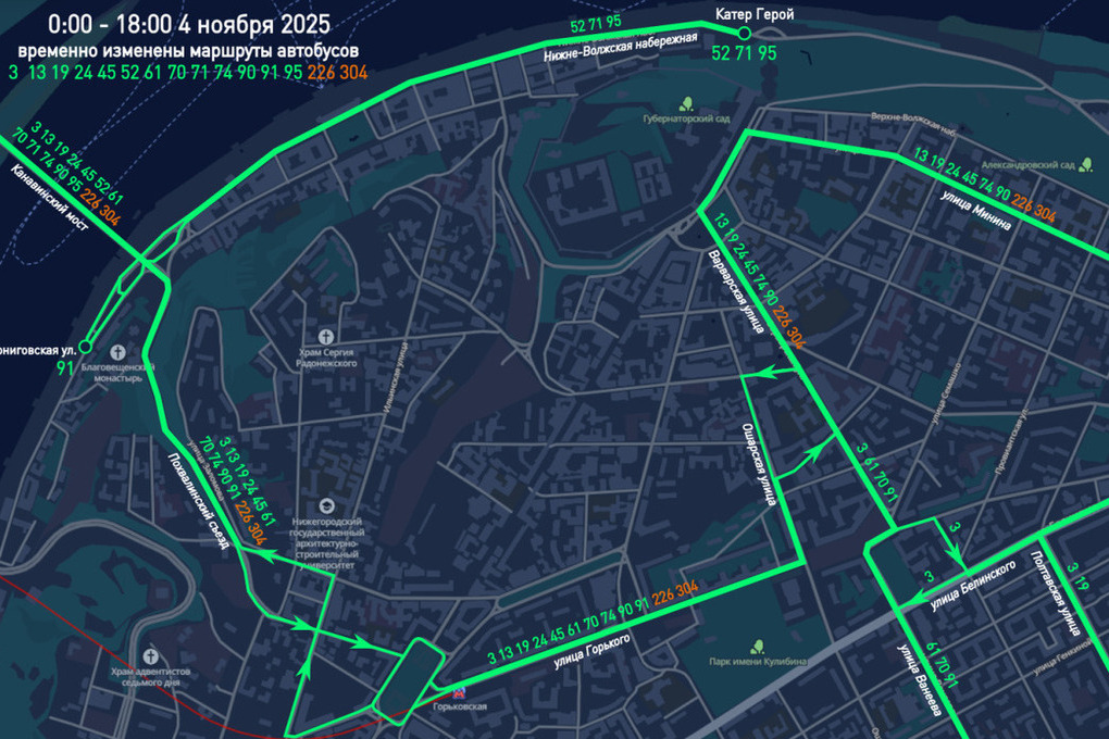 Также 4 ноября с 00:01 до 23:59 будет действовать запрет на остановку и стоянку транспортных средств на улице Советской (от Канавинского моста до площади Ленина) и улице Совнаркомовской (от улицы Керченской до бульвара Мира).