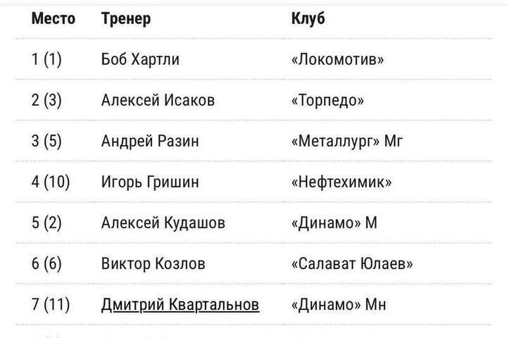 Лидирует в этом рейтинге канадский специалист Боб Хартли, возглавляющий «Локомотив». Третью строчку занимает Андрей Разин, руководящий «Металлургом».