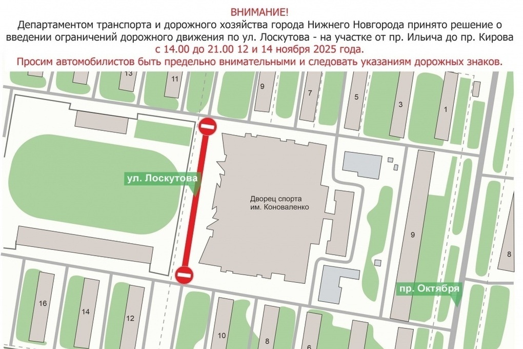 В связи с проведением хоккейных игр будет временно закрыт для проезда отрезок улицы Лоскутова, расположенный рядом с Дворцом спорта имени Коноваленко, сообщили в городской администрации Нижнего Новгорода.