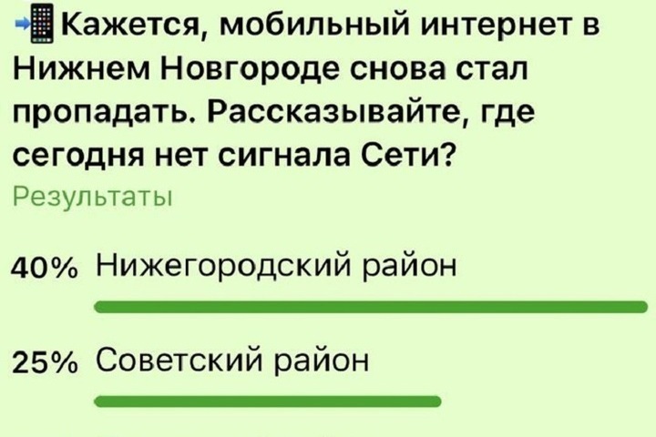 Кроме того, выяснилось, что проблемы с интернет-связью существуют и за пределами Нижнего Новгорода. В частности, 13% жителей области сообщили о перебоях в работе мобильного интернета.