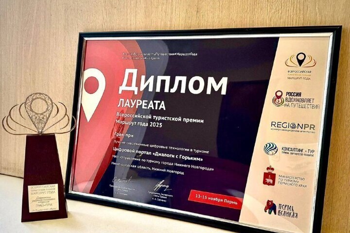 Проект «Диалоги с Горьким» стал главным призёром Всероссийской туристической премии «Маршрут года», написал в своём телеграм-калане мэр Юрий Шалабаев.