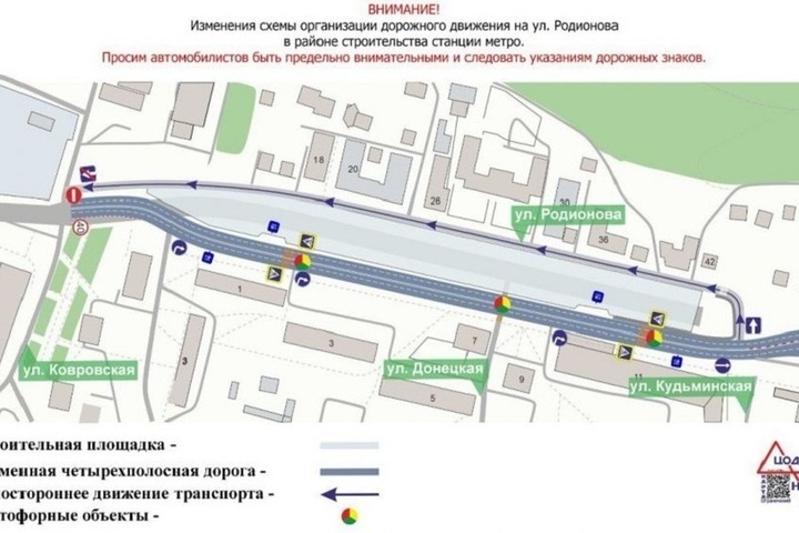 Причиной организации объездного пути стало расширение зоны строительства новой станции метрополитена, необходимое для оборудования оборотных тупиков. Это повлекло за собой закрытие части улицы Родионова. Объездной маршрут заработал 2 декабря, и уже в первый день его использования возникли значительные заторы.