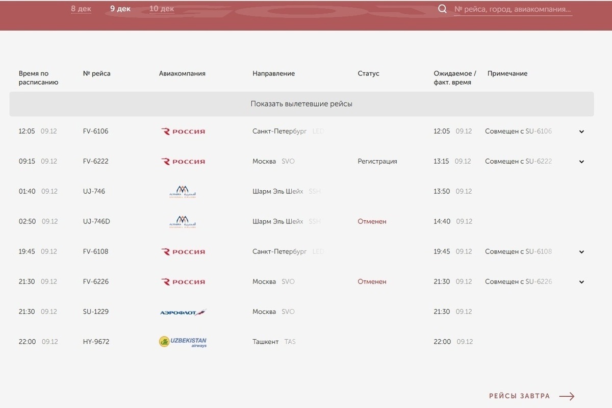 Также была отменена отправка самолета в Шарм-эль-Шейх. Рейс В-737 должен был вылететь в Египет в 02:50 с прибытием в аэропорт курортного города в 07:50. Обслуживание рейса UJ-746D осуществляет авиакомпания Almasria Airlines. Время вылета еще одного рейса в Египет скорректировано на 12 часов – до 13:50.