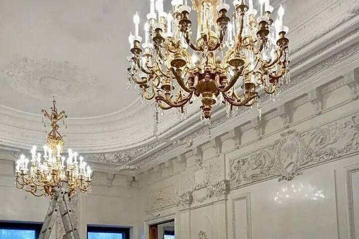 В Дубовом зале работы близки к завершению: установлена первая люстра из дуба, полным ходом идет золочение лепнины. Реставрация лепки выполнена на 94%, как и работы по созданию новых отливов на фасаде здания. Приблизительно на 75-85% завершены работы с оселковым мрамором, восстановление стен, дубовых дверей и черновых полов.