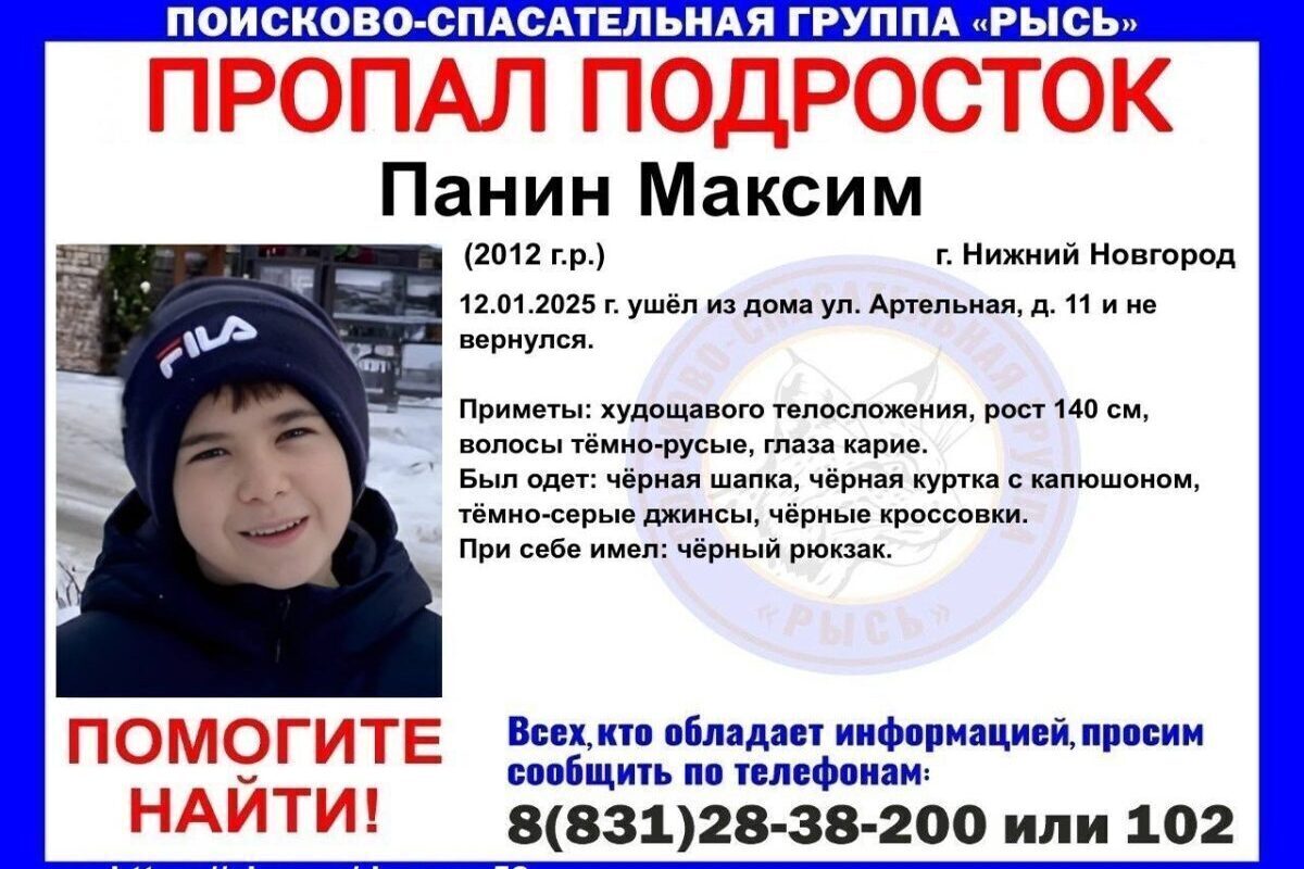 В Нижнем Новгороде разыскивают 13-летнего Максима Панина, который пропал 12 января. Информация об этом была распространена в социальных сетях поисково-спасательным отрядом «Рысь».